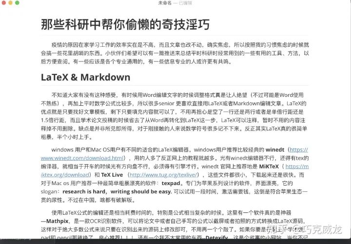 LaTeX其实和Word之间有一个折中,那就是Markdown。Markdown的话推荐一个编辑器 Typora(https://typora.io/)。Markdown就可以像LaTeX那样输入数学公式,也可以像Word那样及时编译所见即所得。这样用起来就会舒服很多。typora不想Word那样有那么多复杂的功能,界面非常简单,让人专注在需要撰写的内容上,非常地优雅,每次打开typora我的心情都不错,而我每次打开Word我都想立刻把它关了。Markdown用来写博客、公众号文章、总结笔记、知乎专栏都很好。下面就是一个页面的例子