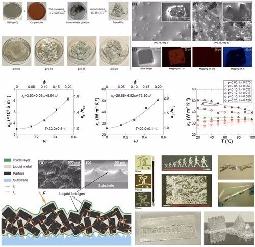 此外,在实验室前期发现的液态金属胞吞效应基础上,联合团队研发出一系列电学、热学及力学性能可调的高性能液态金属功能材料。科研人员在 ACS Applied Materials & Interfaces 上发表的题为 Transitional-State Metallic Mixtures (TransM2ixes) with Enhanced and Tuneable Electrical, Thermal and Mechanical Properties 的论文,研究小组发现,结合液态金属胞吞效应并采用真空干燥的方法快速排除液态金属混合物中的溶液成分,可得到均匀、稳定的功能物质(图3)。由此,通过在液态金属中可控性掺入不同比例的铜颗粒,研究人员研发出了一系列物态介于液体和固体之间的金属混合物。系列测试揭示出这些材料显著的电学、热学及力学性能:在20%的颗粒质量掺比情况下,分别可获得相对于液态金属约80%的电导率增强和约100%的热导率增强。同时,研究发现,颗粒物的掺入显著的提升了材料对各种基底表面的粘附性以及材料自身的可塑性。这些性质的增强和改变,使液态金属混合材料在印刷电子电路、3D快速塑形、增材制造以及界面热管理等领域的应用优势更突出。这种材料可控增强与设计方法的建立,也使未来制备用以满足特殊需求的液态金属功能材料成为可能。