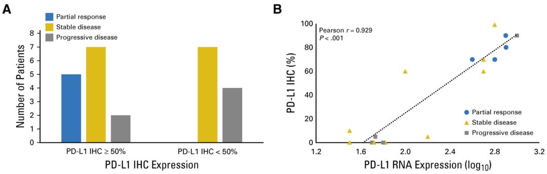 研究人员还分析了24名病人的PD-L1表达情况,发现14人(58.3%)呈现PD-L1高表达状态(>50%),而在这14人中,共有5人(35.7%)获得了局部疗效。在那些PD-L1表达不明显的病人中,没有人通过帕博利珠单抗治疗获得局部疗效。本次Ⅱ期临床试验对那些化疗后复发的胸腺上皮肿瘤患者来说可谓是雪中送炭,胸腺瘤28.6%和胸腺癌19.2%的总体生存率完全说明了K药在治疗这类病人方面的无限潜力。同时,研究人员对病人PD-L1表达的分析也显示,在胸腺上皮肿瘤中,PD-L1的表达情况可能与治疗效果有着一定的关系。虽然不良反应的发生率还比较高,但是相信进一步的研究将更有力的推动PD-1在胸腺肿瘤中的应用。