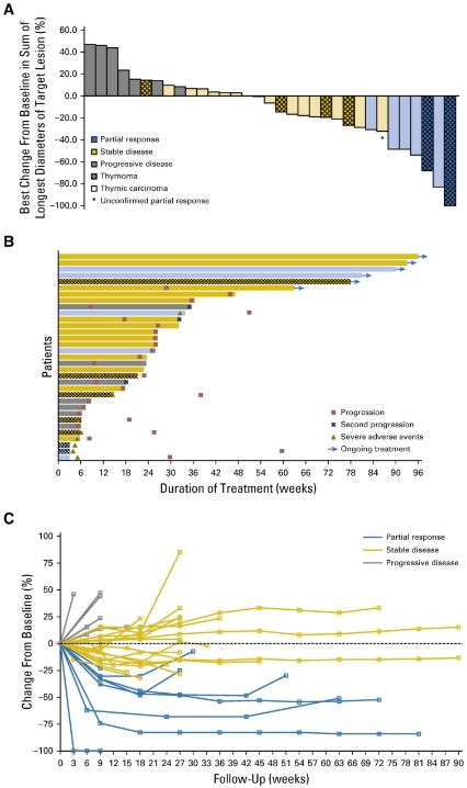 在所有病人中,最常见的不良事件是呼吸困难(11;33.3%),胸壁疼痛(10;30.3%),厌食(7;21.2%),疲劳(7;21.2%),和咳嗽(6;18.1%)。在胸腺瘤患者中,有5人(71.4%)出现了3级以上不良反应,包括了心肌炎(3;42.9%),肝炎(2;28.6%),甲状腺炎(1;14.3%),结肠炎(1;14.3%),结膜炎(1;14.3%),和肾炎(1;14.3%);在胸腺癌患者中,有4人(15.4%)出现了3级以上不良反应,包括肝炎(2;7.7%),重症肌无力(2;7.7%)和亚急性肌阵挛(1;3.8%)。
