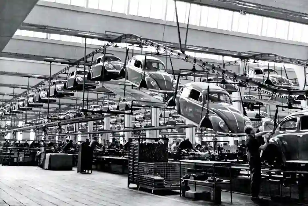 打造甲壳虫:1953年在大众沃尔夫斯堡工厂装配线上的甲壳虫。Keystone-France/Gamma-Keystone via Getty Images