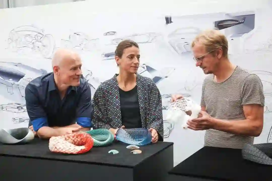 位于波茨坦的欧洲大众未来中心,汽车设计总监彼得·沃达(左)与设计趋势中心主管维蕾娜·托马斯(中间)和乔治·博格曼(右)探讨新设计理念。Courtesy of Volkswagen