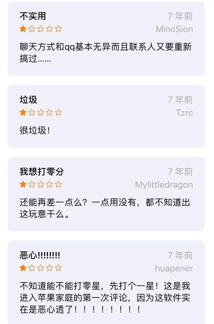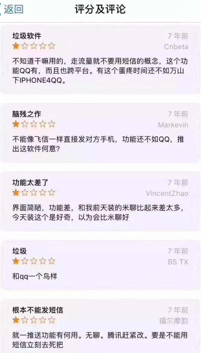 而七年前的微信产品评价里,这样的声音就更多见了,不难看出,有很多还是米聊的用户。