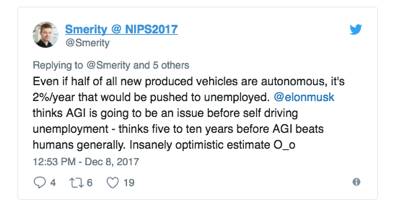 一直以来,Musk以其对无人驾驶汽车的乐观和对AI是否能安全运行的悲观而闻名。在NIPS上,Musk多次谈及他的自动驾驶之梦,称要在两年之内实现L5级的完全自动驾驶,还表示“十年后建成的新车大约有一半是自动驾驶的”。