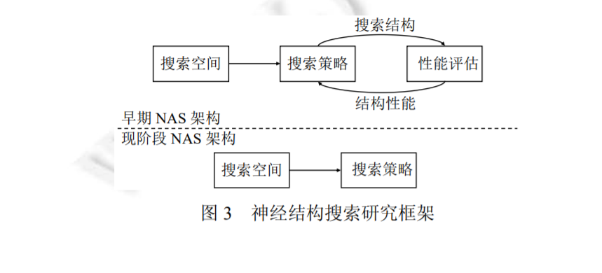 神经结构搜索研究框架如图 3 所示. 具体上, 神经结构搜索的早期方法主要是基于强化学习或进化算法, 指导 神经网络的搜索. 大体的过程如图 3 中的早期 NAS 架构所示, 首先定义好搜索空间, 通过搜索策略采样得到一个 网络结构, 进行性能评估并反馈给搜索策略, 重复上述过程, 直至得到一个表现最佳的神经网络结构. 近年来, 基于 权重共享 (weight-sharing) 的结构搜索方法[4]受到广泛关注, 在这类方法中, 搜索策略和性能评估是高度相关的, 即 往往是一体的. 于是, 现阶段的 NAS 架构主要是在搜索空间定义好的基础上, 进行结构搜索与优化, 继而得到性能 最优的网络结构.
