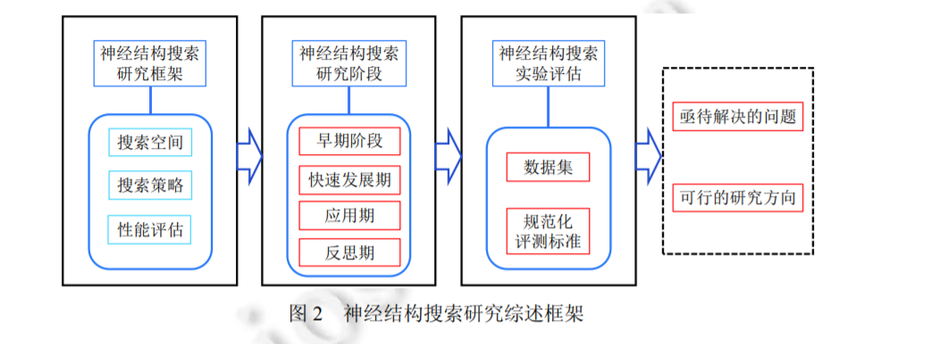 自 2018 年起, 已经有多篇神经结构搜索的研究综述[2−5]对该任务进行了介绍. Elsken 等人[2]给出了较全面的 神经结构搜索领域的研究内容, 并从搜索空间、搜索策略和性能评估 3 个维度对 NAS 方法进行分类介绍. Xie 等 人[4]深入分析基于权重共享的神经结构搜索方法, 并给出现阶段存在的优化缺陷与解决方案, 是目前 NAS 领域最 全面的研究型综述. 然而, 回顾并反思现阶段的 NAS 发展, 最严重的问题就是实验评估中的不公平比较, 以及评估 数据的局限性进一步限制神经结构搜索算法的通用性能, 这两个角度目前尚未在上述综述论文中得到分析, 我们 将详细分析并给出相应的解决方案.