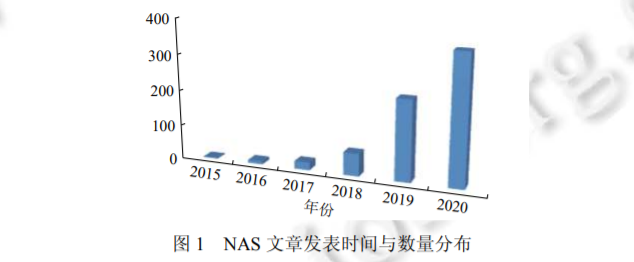 近年来, 神经结构搜索成为人工智能领域中的热点方向之一. 根据 automl.org 列举的文献情况, NAS 文章发表 时间与数量分布如图 1 所示. 自 2015 年起, 关于 NAS 的文章数量呈现指数增长的趋势. 回顾神经结构搜索技术的 发展, 本文对神经结构搜索的已有重点研究工作进行全面综述. 在 NAS 算法发展的初期, NAS 算法通常采用采样 重新训练的策略, 即从预先定义好的搜索空间中采样数量庞大的网络结构, 分别对每个采样结构重新训练并评估 性能, 以获取表现最佳的神经网络. 这是广大研究者公认的真正意义上的一种神经结构搜索方法, 实验结果的优越 性也表明其有效性. 然而, 对于 Cifar-10 数据集, 这类方法需要应用 800 个图形处理单元, 持续近一个月才能完成 对最佳结构的搜索. 因此, 这种采样重新训练策略对计算资源的需求过大, 不利于 NAS 领域的发展与落地应用. 于 是, 为了降低搜索阶段的资源消耗, 神经结构搜索领域内应用最广的一种加速方式: 权重共享策略 (weight-sharing strategy), 即尽可能地利用已经训练好的模型, 避免重新训练. 目前这种权重共享的搜索策略已经成为神经网络结 构搜索的主流方向. 简而言之, 首先将预先设定的搜索空间表示为已经训练好的超级网络 (super-network), 然后在 保留原始权重的同时, 直接对采样的子结构 (sub-architectures) 进行性能评估, 不需要重新进行模型训练.
