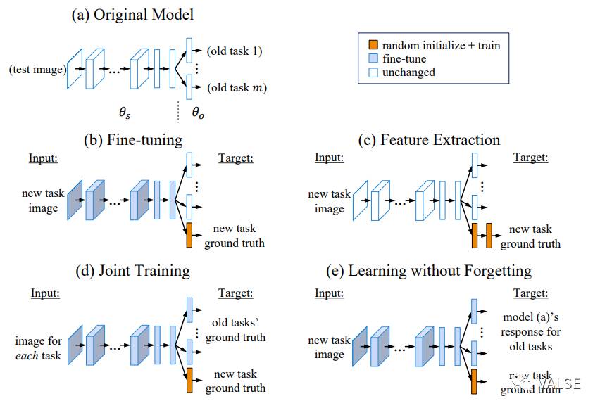 在这之后一个比较重要的工作来自于”Learning without Forgetting” (LwF) [3],这篇文章仍然从最简单的分类任务入手,巧妙运用了Knowledge Distill技术来缓解这样的问题。具体地,[3]使用旧模型作为teacher model,对于新任务中的每一个样本。和传统的Finetune比起来,LwF使用了teacher model输出的soften softmax对新任务中的样本进行约束。这里即使新任务与旧任务的类别定义不尽相同,但是这样的信息仍然可以利用新样本帮助维持旧任务中对样本的embedding结构,从而改善旧任务的性能;和固定网络权值抽取特征,再训练新任务的分类器比起来,显然使feature extractor适应新任务,会使新任务性能大幅提高;最后和Joint Training,即将新任务和旧任务一起训练比起来,LwF不需要存储旧任务的样本。Joint Training的性能可以任务是此类方法性能的上限。下图直观比较了几种将CNN adapt到新任务上的方法: