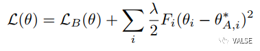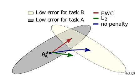 灰色和黄色分别是对应旧任务和新任务的error surface。这里为了示意,在最终收敛参数周围,使用了二次近似,在平面上,即为一个椭圆。如果我们在Finetune的时候不加入任何约束,那么最终收敛的参数自然会到新任务loss最低的地方,即蓝色箭头所指方向。但是显然,这样的结果对于旧任务是一个很差的参数。如果我们能够充分使用局部error surface的信息,使参数收敛到上图中两个椭圆重叠的部分,那必然是一个最好的结果。这也就是[4]这个工作想要达到的目的。具体做法上,作者使用了Fisher Information Matrix来近似Hessian Matrix,并为了效率考虑,只选取了对角线元素做近似,即