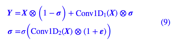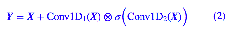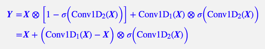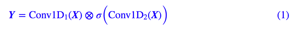 注意这里的两个 Conv1D 形式一样(比如卷积核数、窗口大小都一样),但权值是不共享的,也就是说参数翻倍了,其中一个用 sigmoid 函数激活,另外一个不加激活函数,然后将它们逐位相乘。