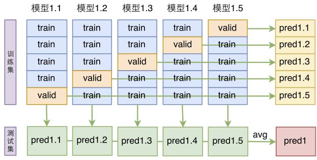 这样一来,我们就得到了同一个模型的 k 个不同训练结果,然后将这些结果平均一下,就是模型融合了: