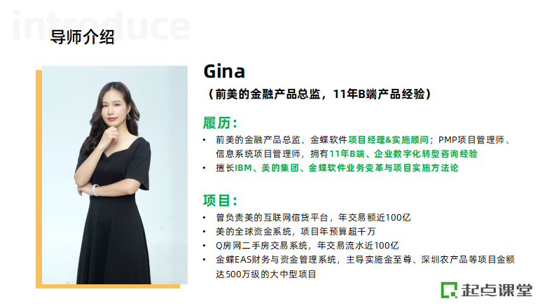 这是由起点课堂(原起点学院)出品的B端产品公开课,专为正在做B端产品同学,或者对B端产品感兴趣想要了解相关工作内容的同学打造,课程将由前美的金融产品总监@Gina老师直播授课。