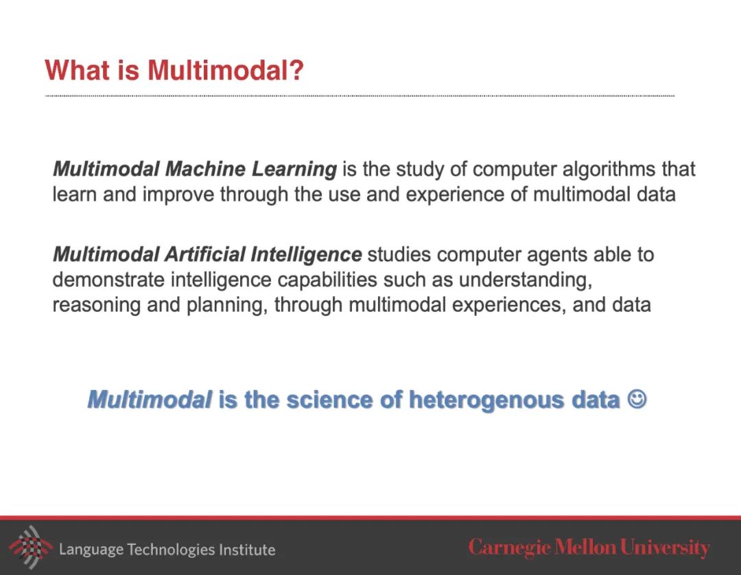 多模态机器学习(MMML)是一个充满活力的多学科研究领域,研究从多个模态建模异构数据的计算方法。本课程介绍机器学习和深度学习的基本概念,涉及多模态机器学习的五个主要挑战: