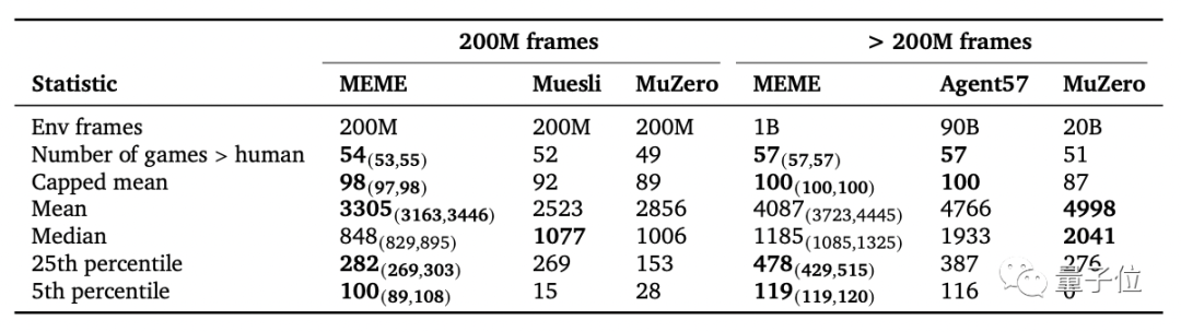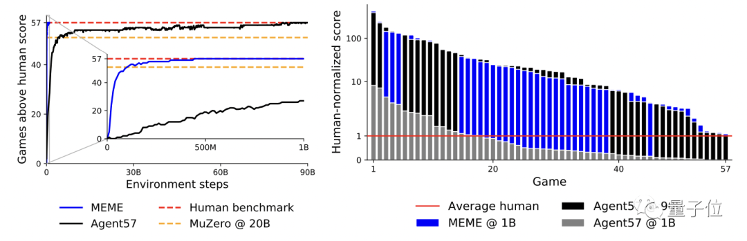 通过下图可以直观的看出,新智能体MEME在3.9亿帧时就超过了人类基准,比Agent57快了两个数量级,并且在将参数量从90B减少到1B的情况下,取得了类似的最终表现。