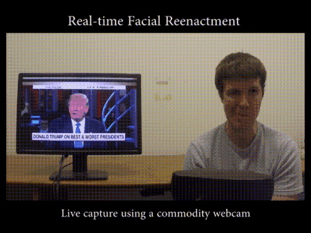 使用者选择一个目标角色,比如川普,系统会将他和川普的面部特征重构并追踪,当他做出一个面部表情时,模型会重新渲染川普的脸的形状和光影,并对背景进行修改。