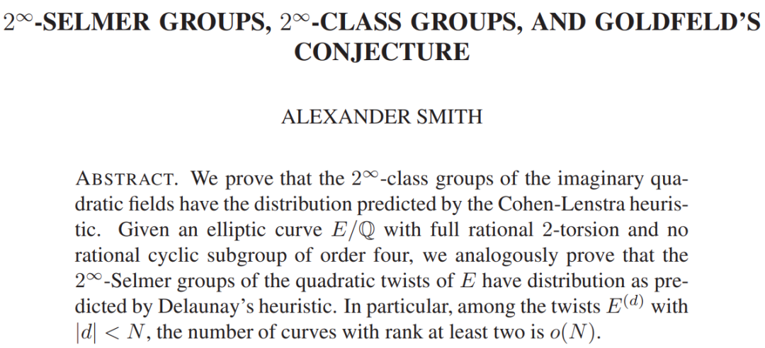 这篇论文的作者是哈佛大学的研究生 Alexander Smith,他现在是斯坦福大学的 Clay fellow。Smith 一直在探究椭圆曲线方程解的性质。在研究这个问题的过程中,他验证了 Cohen-Lenstra 猜想的特定部分,并且恰好涉及 Koymans 和 Pagano 的工作中关于类群的部分。