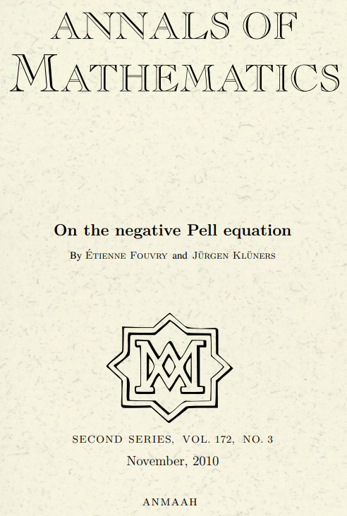 2010 年,一篇发表在《Annals of Mathematics》上的论文表明适用于负佩尔方程的 d 值的比例在一定范围内。为此,论文作者 Étienne Fouvry 和 Jürgen Klüners 掌握了相关类群的某些元素的行为,并需要了解更多元素,才能了解 Stevenhagen 更精确的 58% 估计。不幸的是,有些元素仍然难以理解:仍然需要新的方法来理解它们的结构,几乎不可能有进一步的进展。