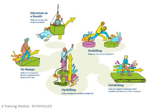 将教育作为一种福利的培训模式,在许多方面式正在改变中等技能工人的教育和工作顺序:他们过去上大学是为了找工作,现在他们找工作是为了上大学。例如,得益于有意义的税收优惠,星巴克等公司正与亚利桑那州立大学等机构建立合作关系,为员工提供在线学士学位课程,无论这些课程与员工当前的工作或星巴克的潜在职业道路是否直接相关。星巴克学院的成就计划为每一位符合条件的员工提供100%的首次学士学位学费。
