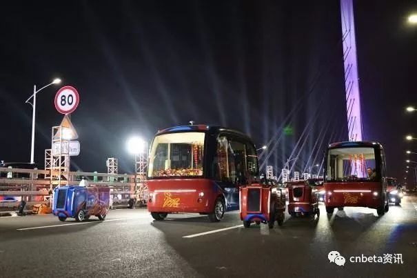 无人车:百度家的 Apollo 无人汽车在无人驾驶模式下实现了交叉并进,这个难度不小。不过这并不是重点,可能镜头闪的太快,大部分人都只看到了百度的阿波罗无人汽车,但实际在港珠澳大桥上跑的可不只有无人汽车,还有无人新能源扯、无人巴士、无人清扫车、无人快递车...