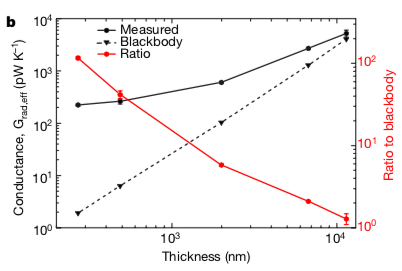 ○ 实验测量到的热量传导率(黑色圆点实线)大于普朗克黑体辐射定律预测的值(倒三角虚线),而且如果物体的厚度越小,实验与理论预测结果的比率(红色圆点实线)就越大。| 图片来源:Dakotah Thompson et al.
