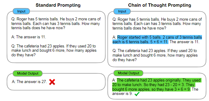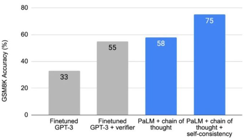 思维链技术在算术基准GSM8K上将准确率从17.9%提升到了58.1%,后来引入的投票自洽(self-consistency)机制进一步将准确率提升到74.4%