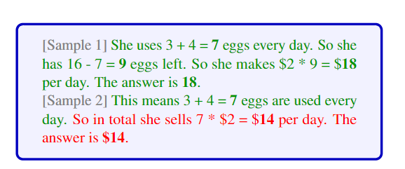 一个关键的问题是如何获取不同的prompt,假定已经获取一个样例库后,我们可以从中采样K个样例来构造一个prompt,然后重复5次即可
