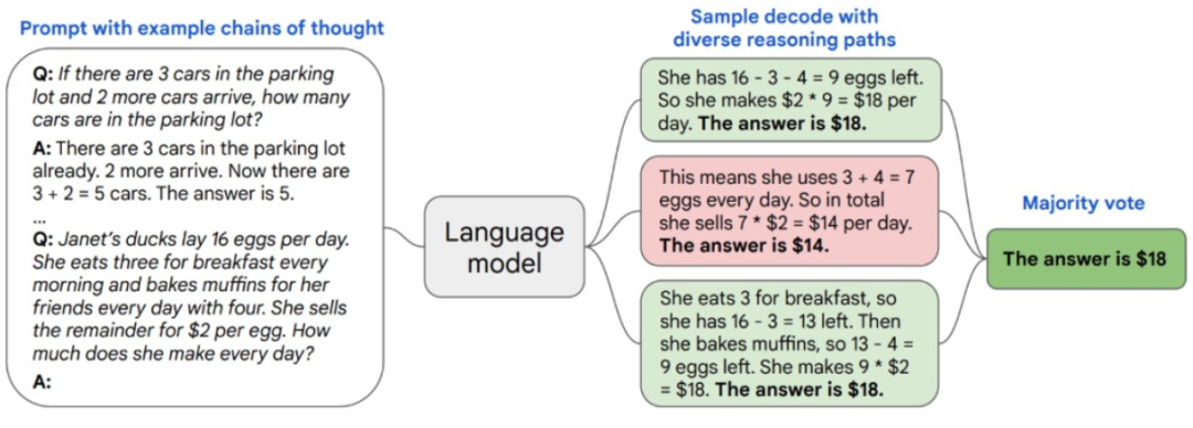 简单来说,复杂的推理任务通常有多个能得到正确答案的推理路径,自洽方法通过思维链从语言模型中采样一组不同的推理路径,然后返回其中最自洽的答案。