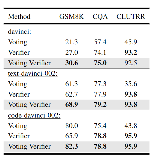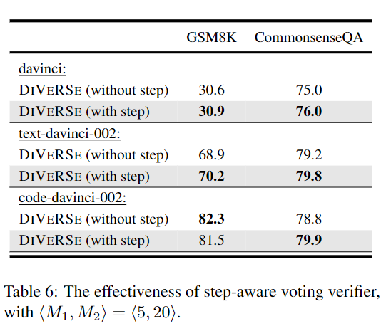 而在大多数实验中,将voting verifier扩展为step-aware版本可以带来性能的提升。对于GSM8K上的code-davinci-002,step-aware版本的verifier则会导致性能略有下降。