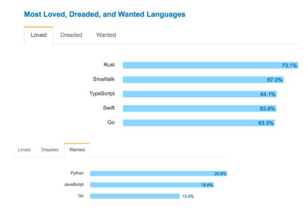 在 Stack Overflow 的 2017 年开发者调查中 ,在最受欢迎的编程语言和最想要尝试的语言的两个排行榜中,Go 语言是唯一一个同时进入两排行榜前五的语言