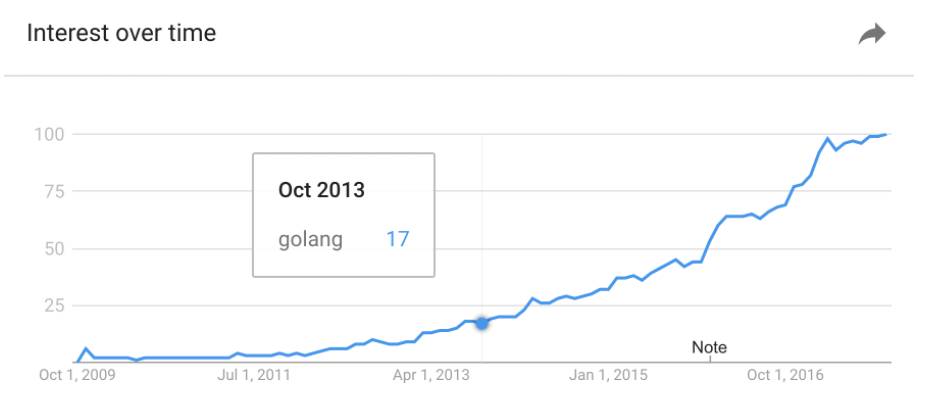 Go 语言的受欢迎程度在过去的 8 年里呈指数增长,并且还在持续增长。