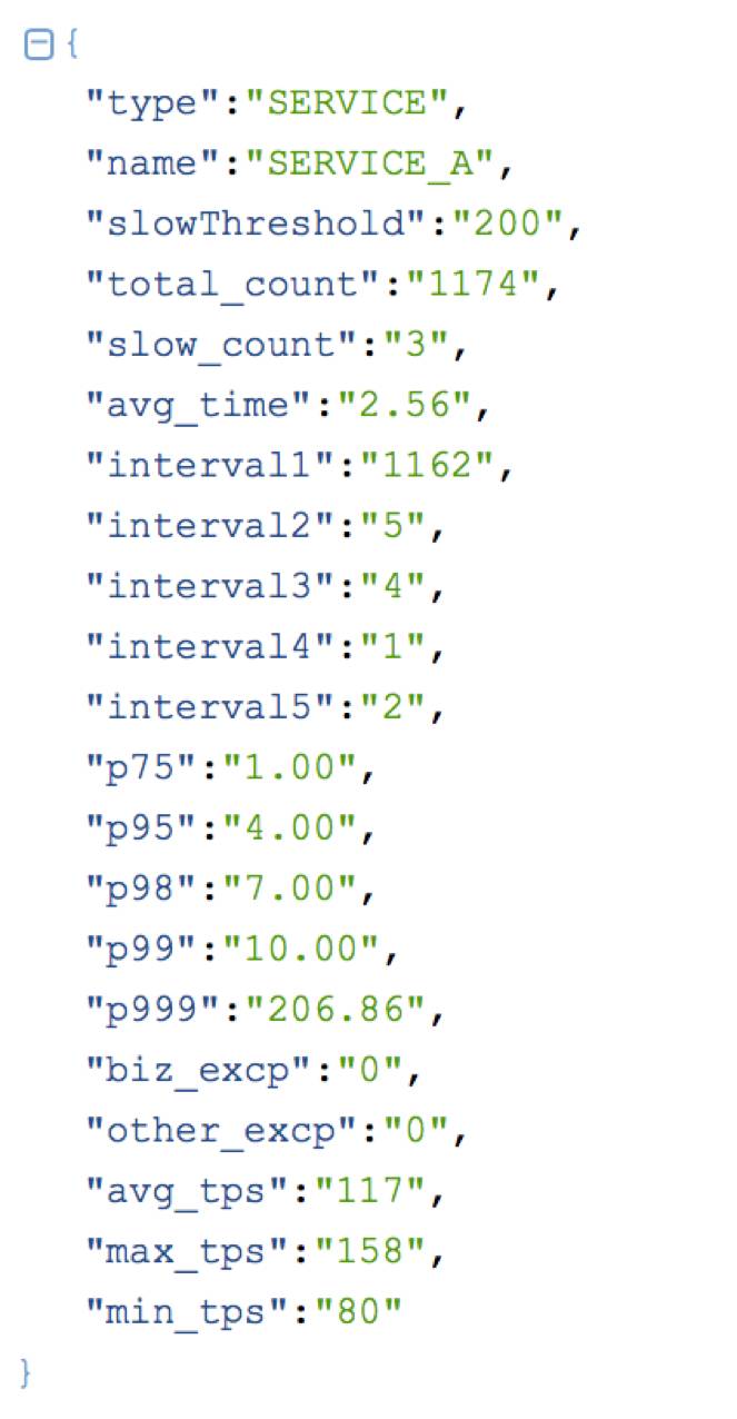 指标的采集主要涉及两个问题,一个是如何规范 metric 日志,便于在不同系统间传递,一个是如何传输的问题,有多种途径如 scirbe、kafka、udp 等。为了解决第一个问题,我们制定了规范的 profile 日志格式,各种 metric 信息均以标准的格式记录,如下图 7 所示。为了简化系统和传输效率,我们通过 udp 方式将各种 metric 信息传递给监控系统。