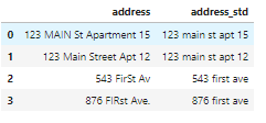 df_add_ex['address_std'] = df_add_ex['address'].str.lower()df_add_ex['address_std'] = df_add_ex['address_std'].str.strip() # remove leading and trailing whitespace.df_add_ex['address_std'] = df_add_ex['address_std'].str.replace('\\.', '') # remove period.df_add_ex['address_std'] = df_add_ex['address_std'].str.replace('\\bstreet\\b', 'st') # replace street with st.df_add_ex['address_std'] = df_add_ex['address_std'].str.replace('\\bapartment\\b', 'apt') # replace apartment with apt.df_add_ex['address_std'] = df_add_ex['address_std'].str.replace('\\bav\\b', 'ave') # replace apartment with apt.df_add_ex