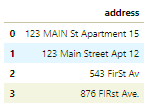 # no address column in the housing dataset. So create one to show the code.df_add_ex = pd.DataFrame(['123 MAIN St Apartment 15', '123 Main Street Apt 12 ', '543 FirSt Av', ' 876 FIRst Ave.'], columns=['address'])df_add_ex