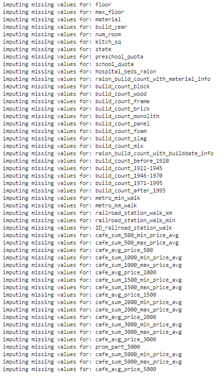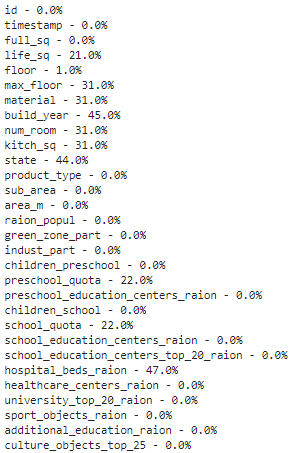 # import packagesimport pandas as pdimport numpy as npimport seaborn as snsimport matplotlib.pyplot as pltimport matplotlib.mlab as mlabimport matplotlibplt.style.use('ggplot')from matplotlib.pyplot import figure%matplotlib inlinematplotlib.rcParams['figure.figsize'] = (12,8)pd.options.mode.chained_assignment = None# read the datadf = pd.read_csv('sberbank.csv')# shape and data types of the dataprint(df.shape)print(df.dtypes)# select numeric columnsdf_numeric = df.select_dtypes(include=[np.number])numeric_cols = df_numeric.columns.valuesprint(numeric_cols)# select non numeric columnsdf_non_numeric = df.select_dtypes(exclude=[np.number])non_numeric_cols = df_non_numeric.columns.valuesprint(non_numeric_cols)