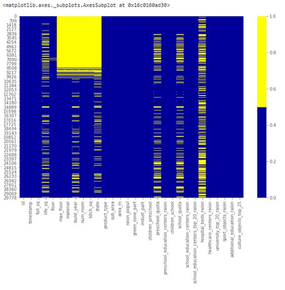 cols = df.columns[:30] # first 30 columnscolours = ['#000099', '#ffff00'] # specify the colours - yellow is missing. blue is not missing.sns.heatmap(df[cols].isnull(), cmap=sns.color_palette(colours))