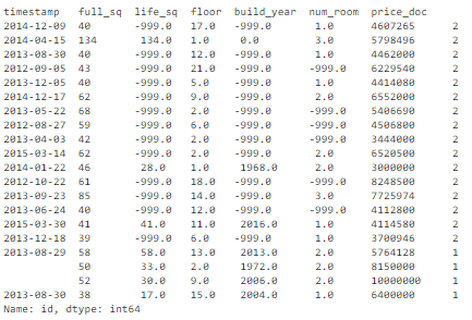 key = ['timestamp', 'full_sq', 'life_sq', 'floor', 'build_year', 'num_room', 'price_doc']df.fillna(-999).groupby(key)['id'].count().sort_values(ascending=False).head(20)