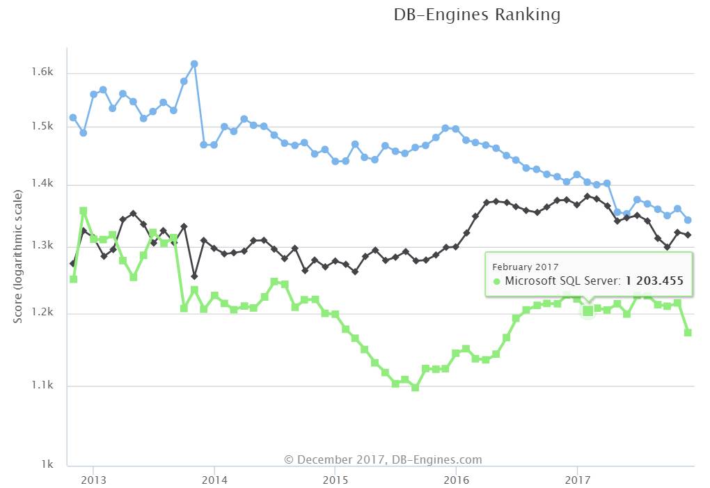DB-Engines 发布了 2017 年 12 月份的数据库排名。排前 20 名的数据库中,Oracle 稳居第一,排名在第 9 名的 Cassandra 赶超排在第 8 名的 Redis,第 14 名的 SAP Adaptive Server 赶超第 13 名的 Solr,SQLite 有小幅下降趋势。