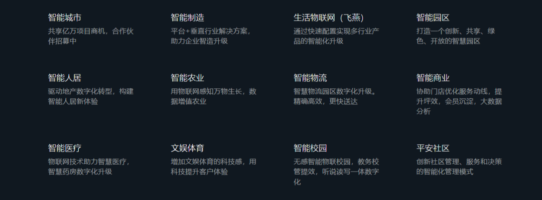 随 IoT 建设的深入,行业内对物联网解决方案的划分也渐进清晰,如生活物联网、智慧农业、智慧制造、智慧城市、智慧园区等。