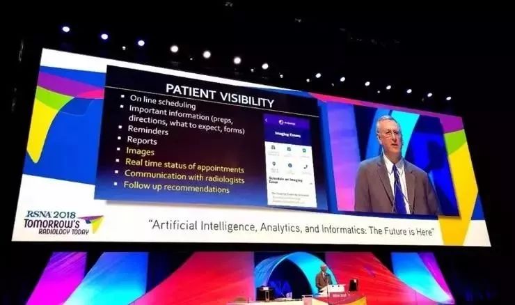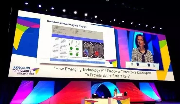 大会主席Vijay M.Rao和Michael P.Recht教授相继发表主题演讲,均谈到了医疗AI的发展与展望。Vijay M.Rao的演讲主题为“How Emerging Technology Will Empower Tomorrow's Radiologists to Provide Better Patient Care”(如何应用新技术,使未来放射科医生更好地服务患者)”。Rao在演讲中表示,未来AI和机器学习等新技术将在放射科发挥巨大价值,我们目前看到的只是冰山一角。她指出,AI等创新技术将推动影像技术朝着“faster、safer、quantitative、 precise and affordable(快速、安全、定量、精准、经济)”的方向发展。同时,由影像资料、临床信息、基因特征、风险因素等构建的信息中心将对患者的个体化治疗提供巨大帮助。