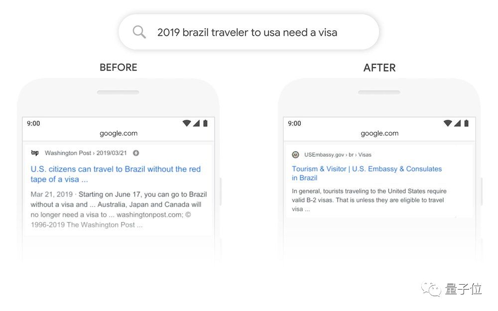前面提到的查询“2019 brazil traveler to usa need a visa”,过去由于搜索引擎无法理解语义,不知道“前往”(to)在这句话中的重要性,因此返回了错误的结果。