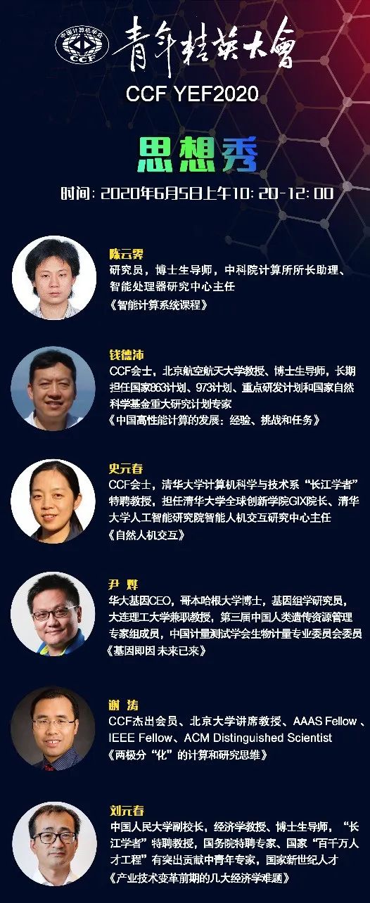 本届 YEF2020 将特邀六位来自人工智能、高性能计算、人机交互等领域的青年学者、产业先锋进行分享,他们是——