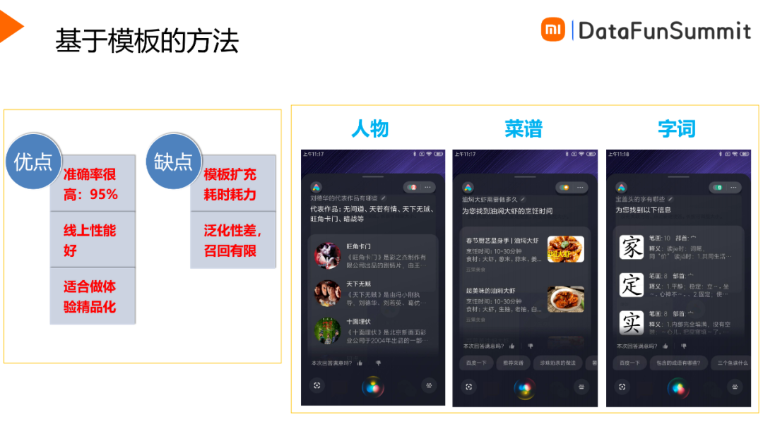 基于模板的方法准确率比较高,线上性能表现的较好,另外比较适合做体验精品化,如上图所示,通过结构化的解析,将结构化的字段向用户展示,给用户带来更好的体验。基于模板的方法缺点也比较明显,首先就是模板的扩充耗时耗力,需要大量人工处理,另外它的泛化性比较差,召回也相对有限。