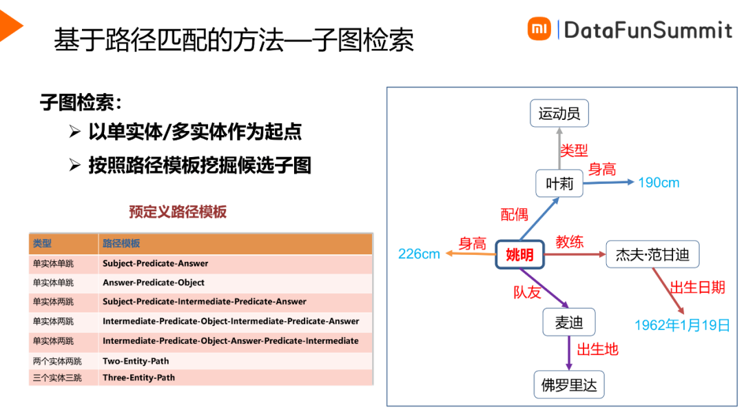 子图检索主要分为路径挖掘和约束添加两步。首先是路径挖掘,以实体链接步骤中所确定的单实体/多实体作为起点,根据定义的路径模板在图谱中挖掘候选子图。如上图所示,在“姚明”作为起点,可以得到的路径举例如下:。