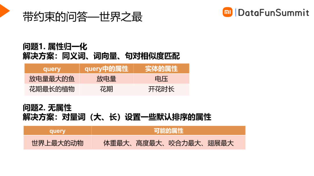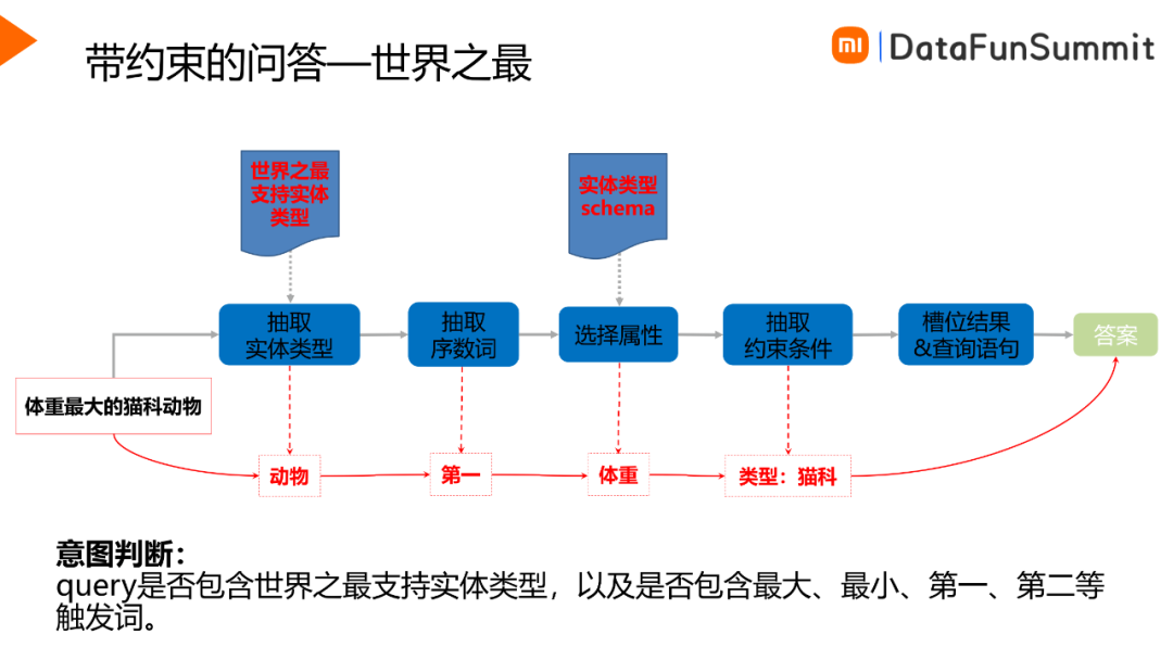 线上用户所询问的问题不仅仅是简单的问题,很可能会附带一些约束,比如时间约束、位置约束、最大最小值查询的约束等。在我们的场景中,用户常问的问题属于世界之最的问题,例如用户不仅是想知道老虎的体重是多少,可能还想知道体重最大的猫科动物是什么。针对于世界之最的问题,我们的解决方案如下图所示: