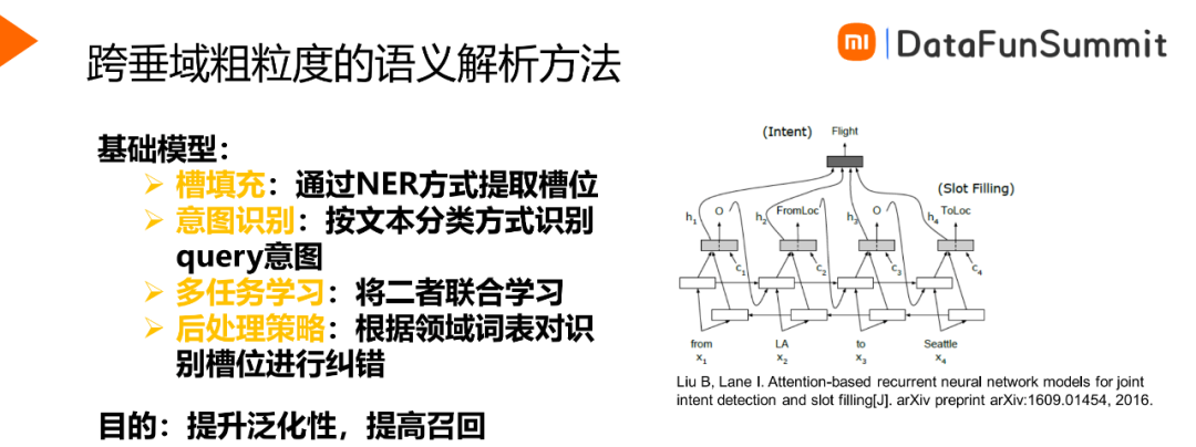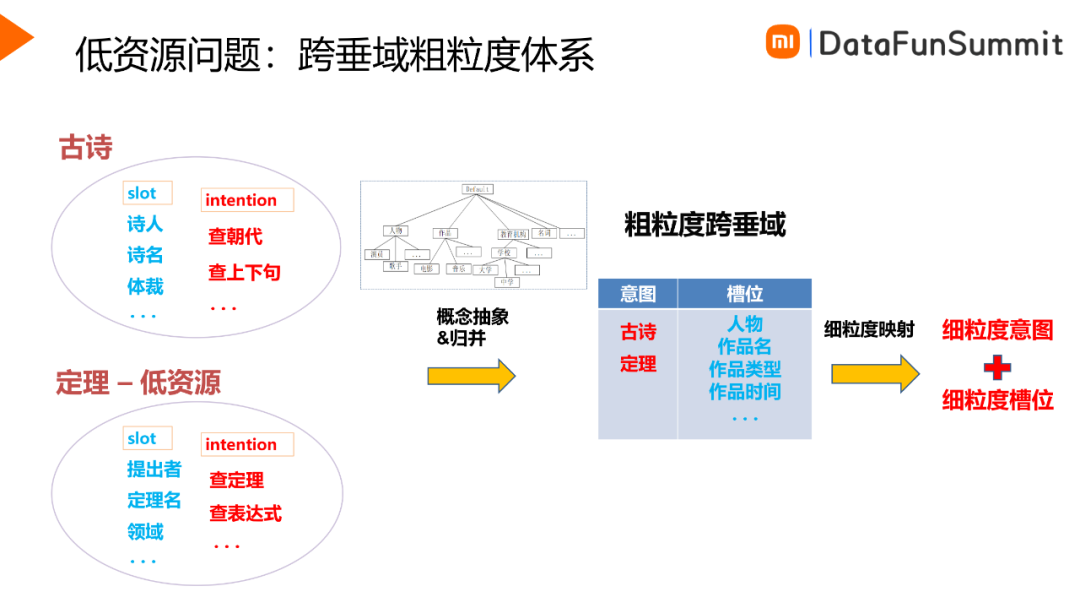 比如我们要建设古诗垂域,如上图所示,首先定义好古诗垂域下的意图与槽位,古诗相关的槽位包括诗人、诗名、体裁等,意图包含查朝代,查上下句等。根据定义好的体系,获取训练数据,之后可以进行意图/槽位联合模型的训练,最终在线上部署并生效。建立新的垂域需要进行重复的工作,另外在小垂域方面训练样本比较少,样本标注的成本相对较高,这是垂域建设面临的问题和挑战。为此我们提出了一种跨垂域粗粒度的体系,可以将意图槽位体系进行抽象与归并。假如我们要新建定理垂域,它的训练数据非常稀疏,那么我们可以对意图和槽位进行归并。比如,在槽位上,诗人与提出者都属于人物,那么我们就可以归并为人物。类似的,诗名和定理名可以归并为作品名。每个垂域独有的槽位可以直接继承下来。在意图上,直接使用两个垂类作为类别,得到粗粒度的意图体系。预测的时候,我们先得到粗粒度的意图和槽位结果,然后通过映射关系得到细粒度的意图和槽位,作为最终的解析结果。