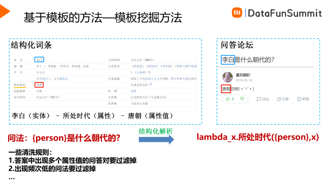 如上图所示,是一个快速获取批量模板的方法。例如有一个结构化的词条李白,词条当中有一个属性“所处时代”对应的取值为“唐朝”,如果一个问答对中的Query包含“李白”,Answer中包含“唐朝”,那么这个问答对很有可能询问的就是“所处时代”这个信息,因此就可以得到一个模板“xxx是什么朝代的”。依次类推遍历所有问答对数据,对模板进行频次统计,通过人工过滤就可以得到高质量的模板库。