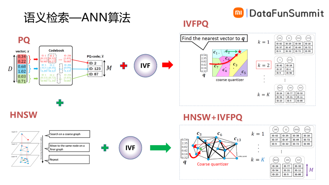 线上全量检索时,用户Query的语义向量与doc的语义向量一一进行匹配计算对服务的性能要求很高,另外加载全部的数据内存占用也比较大。研究者提出了很多ANN最近邻算法优化检索性能。如上图所示,IVF的思路是将doc向量进行聚类,找到与用户Query最近的类,然后在类内找到最近的语义向量,这样可以明显减少耗时,但无法解决语义向量占用内存高的问题。PQ则是牺牲一定的精度,将高维语义向量进行降维,获取更低的内存占用。将PQ与IVF联合可以得到IVFPQ,它首先找到与用户Query最近的类,将类内的语义向量进行降维,这样既可以降低内存占用,又可以提升性能。HNSW是一个分层的最近邻网络,越上层是越粗略的层,越下层是越细致的层。首先根据用户Query在最上层找到最近的节点,然后映射到下一层找到下一层中最近的点,依次类推得到最后的结果。它同样可以与IVF进行结合得到HNSW+IVFPQ的检索方式。