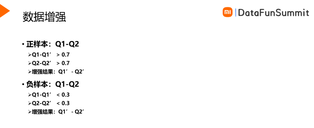 高质量的人工标注数据对匹配模型的效果影响很大,所以我们尝试了通过数据增强来提升人工标注数据的样本量。如图所示,一对正样本Q1与Q2,可以分别找到Q1、Q2的相似性样本Q1’与Q2’,可以得到增强的结果Q1’与Q2。同样类似的方法可以构造负样本,以此提升语义匹配效果。