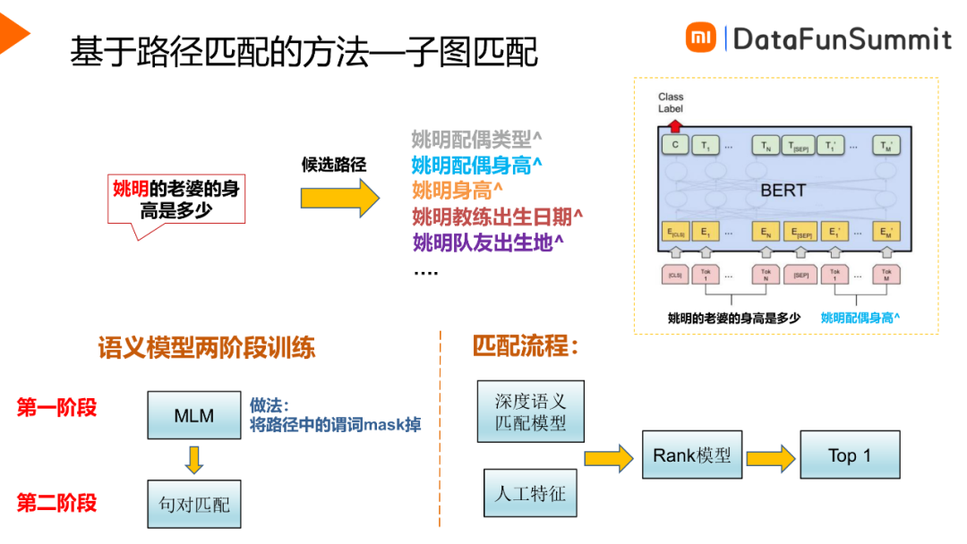 对上步骤得到的候选路径进行子图匹配,匹配时将子图转换为文本描述的形式,转换的时候只需要保留节点信息,要去掉中间节点,另外将答案节点以^代替。对于过滤约束,我们以“大于”、“小于”作为谓词;对于排序约束,我们以“排名”作为谓词。这样的话,子图匹配就变为了一个句对匹配的任务。如上图所示,句子一是用户的Query“姚明的老婆的身高是多少”,句子二是候选路径的文本描述形式:“姚明配偶身高^”,训练一个句对匹配的模型。路径匹配中的谓词是一个重要的因素,谓词决定后续路径的正确与否。因此模型训练分为两个阶段,首先是将路径中的谓词mask掉进行预训练,然后是进行句对匹配的fine-tuning训练。得到语义匹配模型之后结合人工特征进行重排序得到TOP1路径,并从图谱当中获取答案来回答用户的问题。