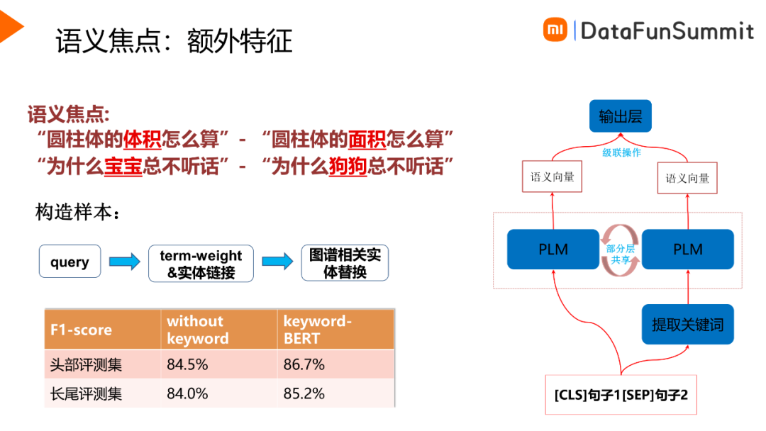 语义匹配方面会遇到语义焦点的问题,例如“圆柱体的体积如何计算”和“圆柱体的面积怎么算”,这两个句子只有核心词不一样,会容易造成模型误判,因此可以引入一些额外特征强化模型对核心词的学习。如上图所示,额外特征为提取的关键词,通过PLM对关键词进行表征,并与原句子的特征进行级联以计算相似度。